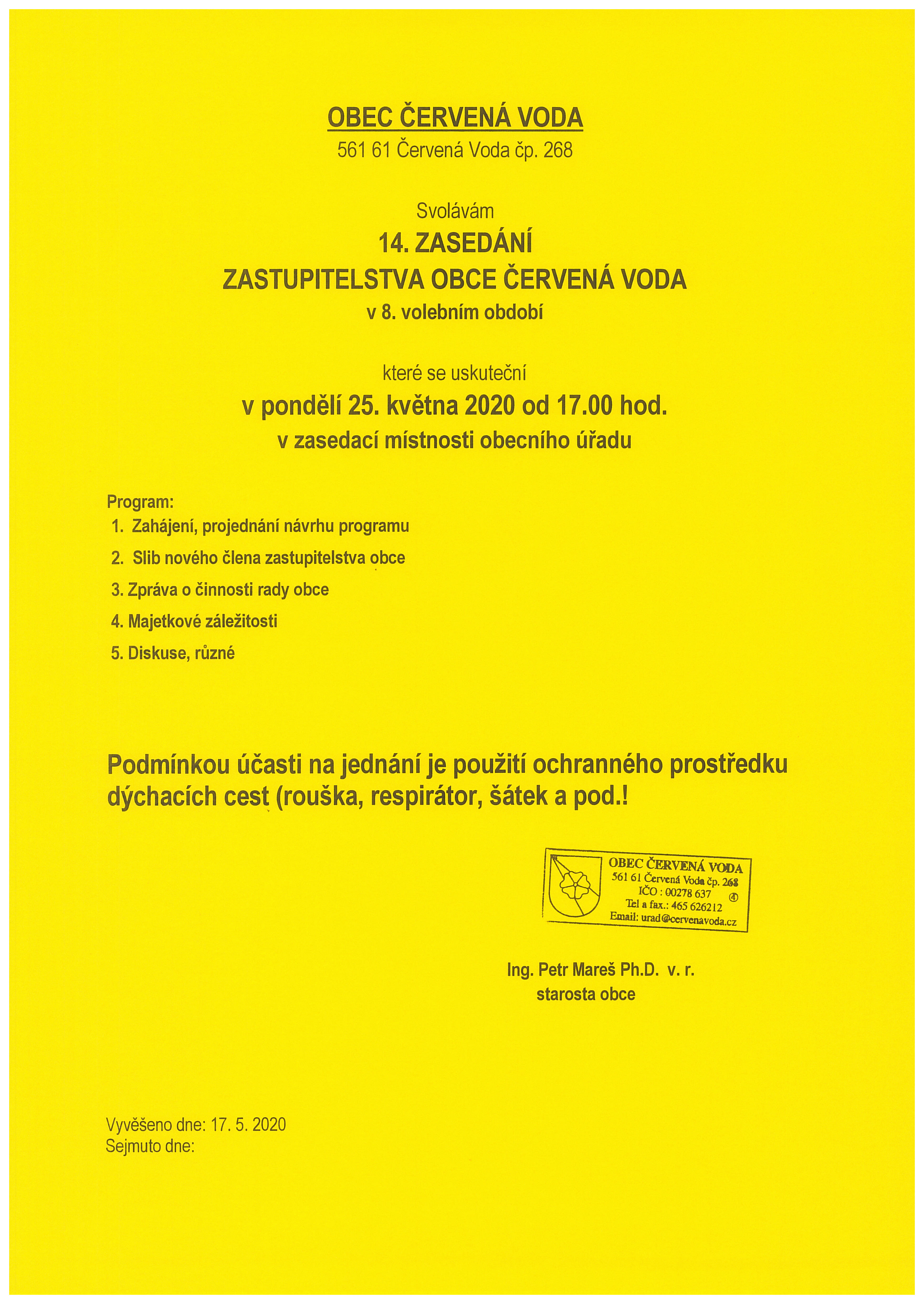 Obec Červená Voda › 14. zasedání zastupitelstva obce 14. zasedání zastupitelstva obce 25. května 2020
