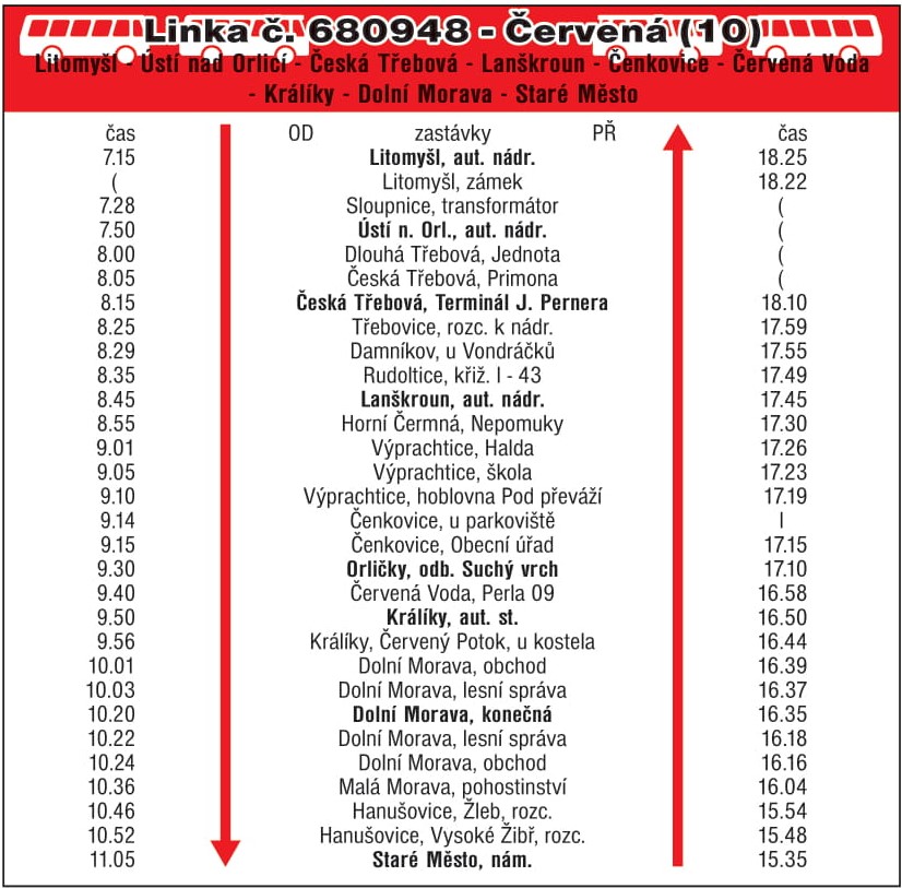 - Linka z Poličky na Dolní Moravu zastavuje v Červené Vodě u obecního úřadu v sobotu, neděli a o svátcích v 10:02 hodin.