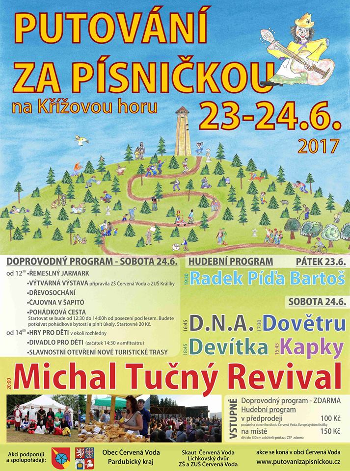 Obec Červená Voda › Putování za písničkou Putování za písničkou 24.6.2017Červená VodaTradiční festival na Křížové hoře - jedenáctý ročník 23. a 24. června 2017. Více informací na http://www.putovanizapisnickou.cz.