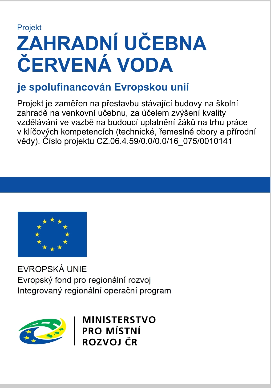 Projekt je zaměřen na přestavbu stávající budovy na školní zahradě na venkovní učebnu, za účelem zvýšení kvality vzdělávání ve vazbě na budoucí uplatnění žáků na trhu práce v klíčových kompetencích (technické a řemeslné obory a přírodní vědy).