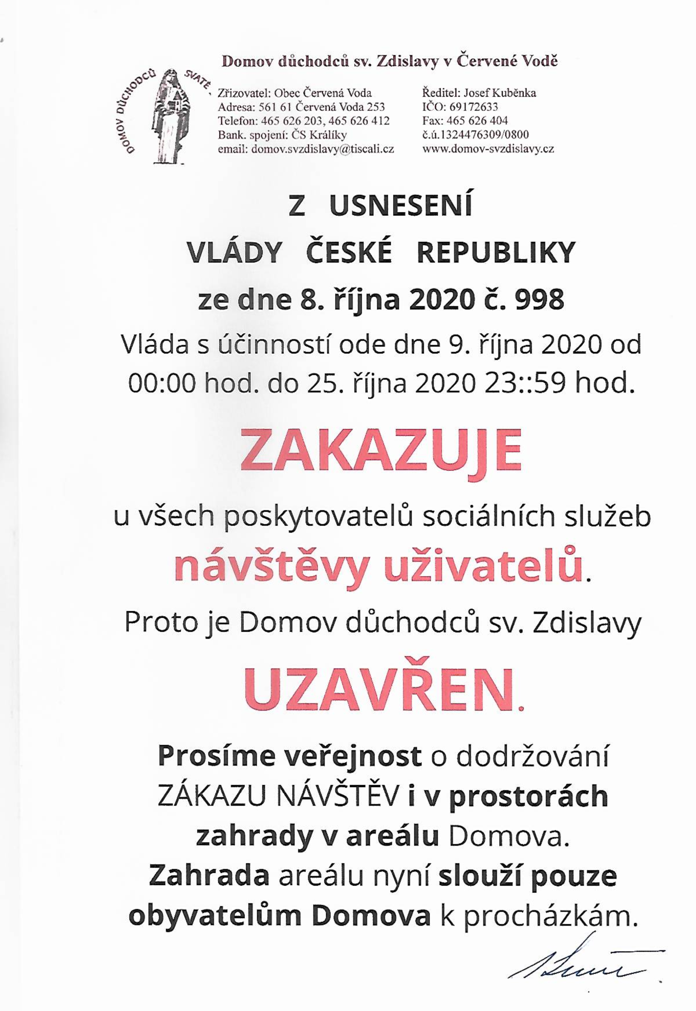 Zákaz návštěv v DD sv. Zdislavy