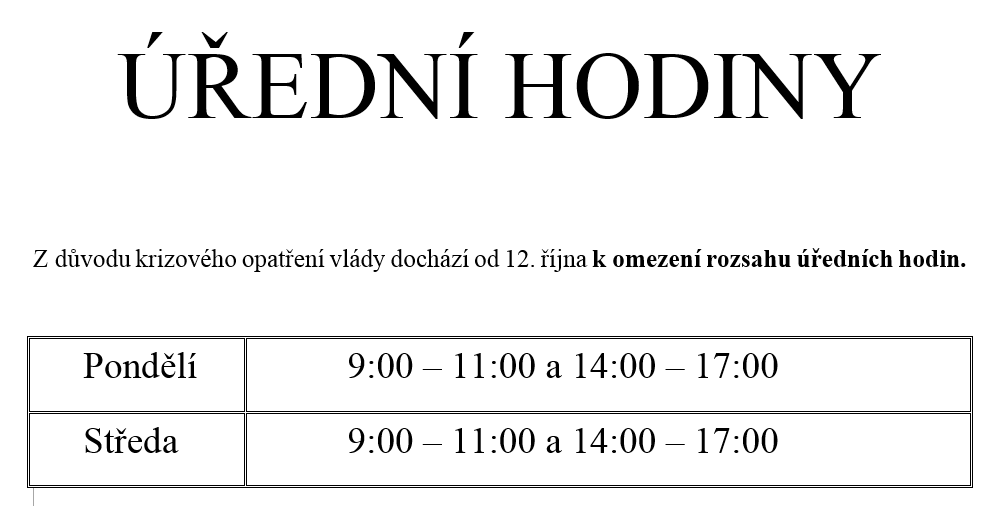 z důvodu krizového opatření vlády dochází od 12. října k omezení rozsahu úředních hodin. Úřední hodiny OÚ jsou nyní každé pondělí a středu od 9:00 do 11:00 a odpoledne od 14:00 do 17:00. Stejně jako při opatřeních z jara Vás i nyní vyzýváme k co největšímu omezení osobního kontaktu a upřednostňování formy písemné, elektronické či telefonické.